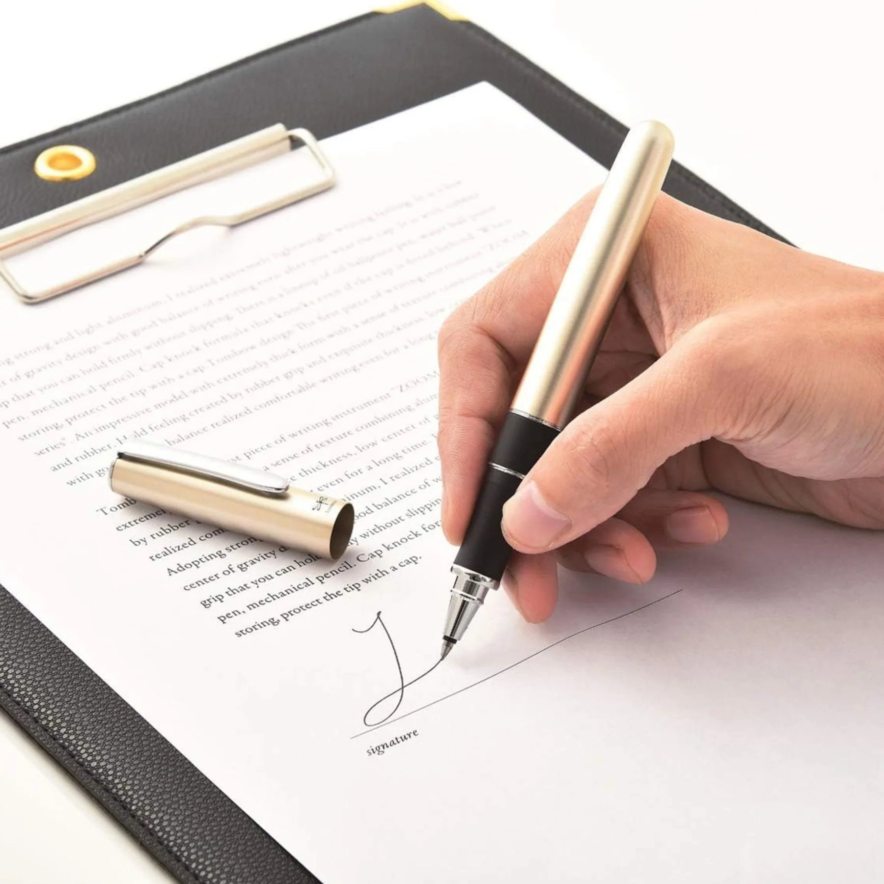 Its thick, aluminum body gives a solid presence, while the rubberized grip ensures comfort for long writing sessions.